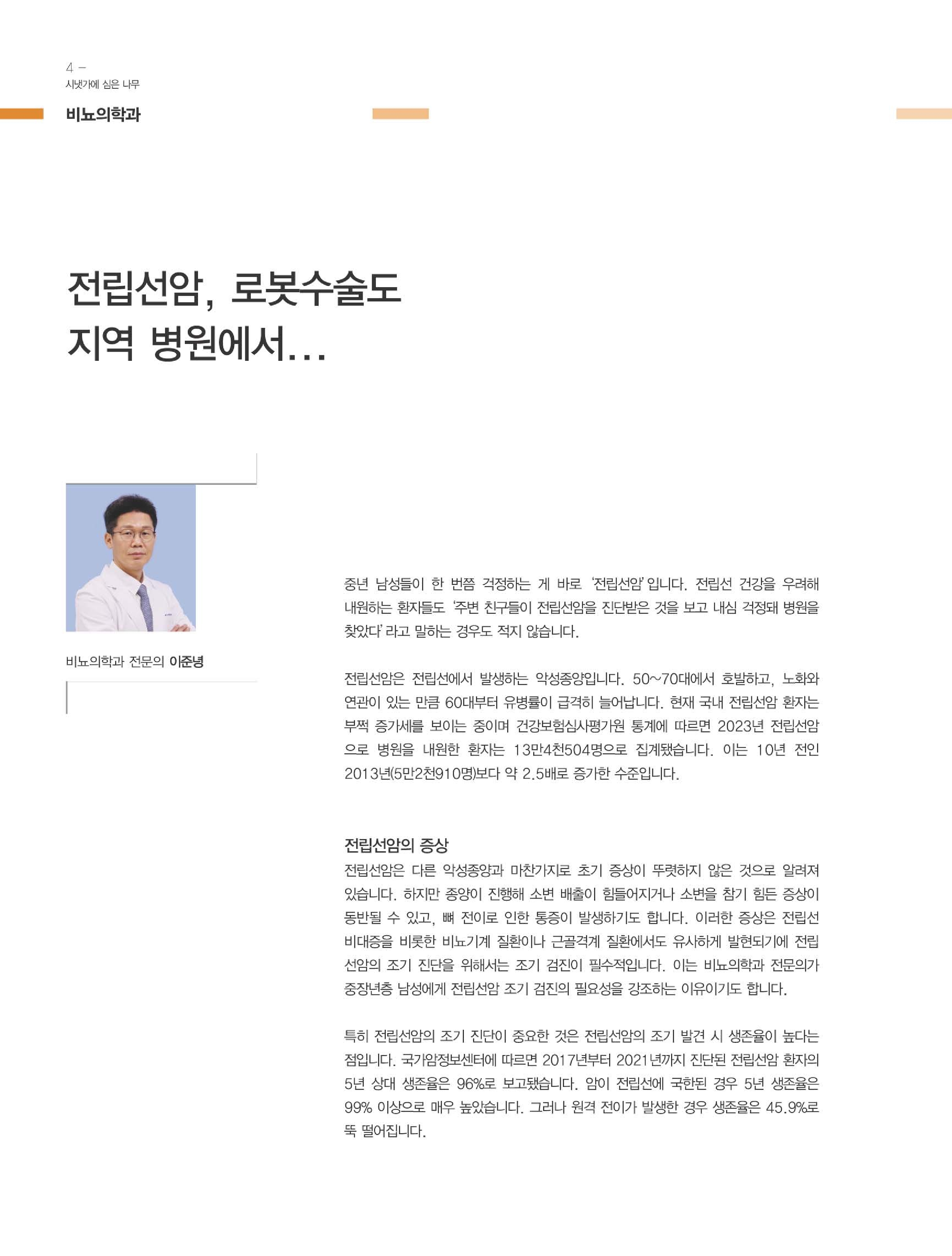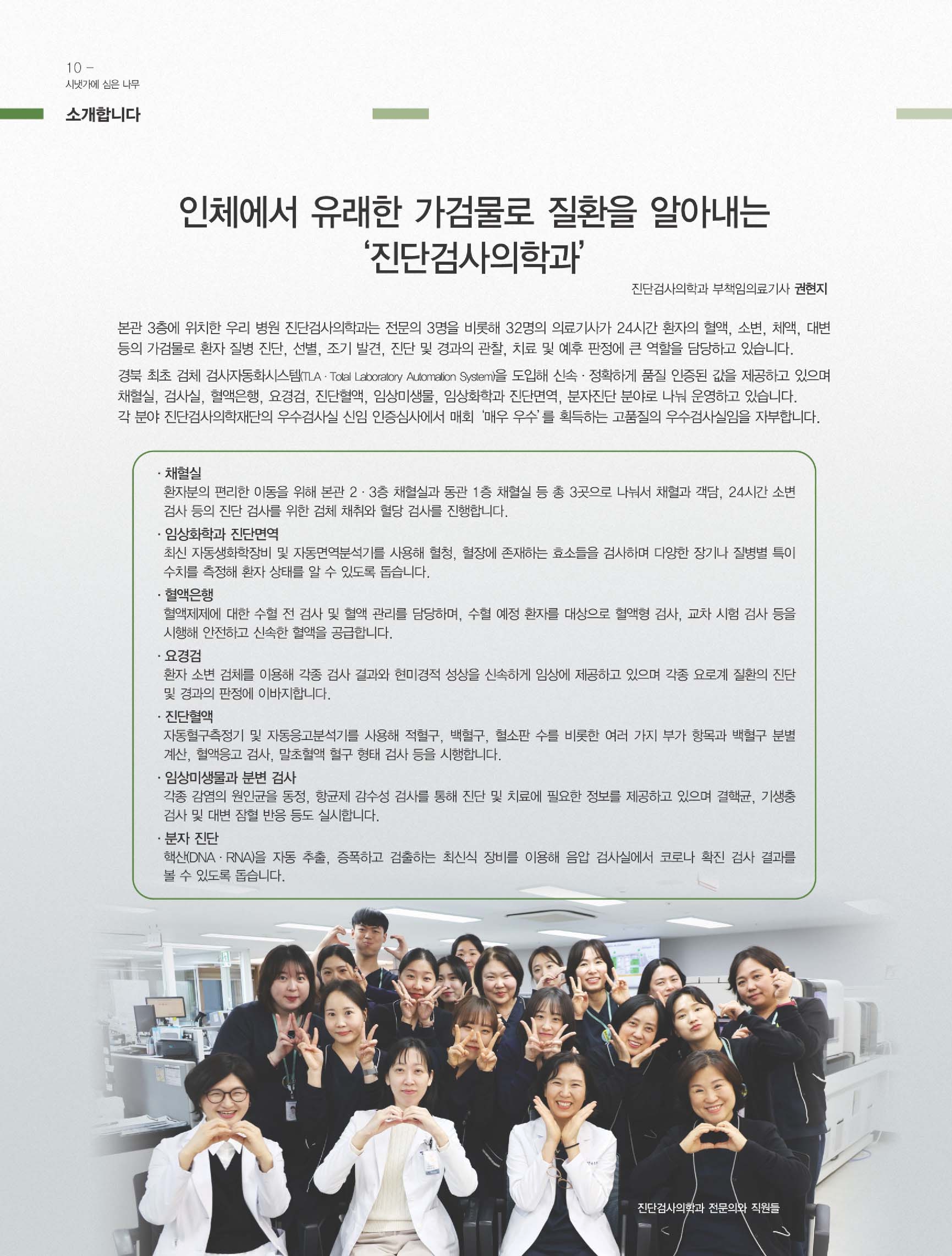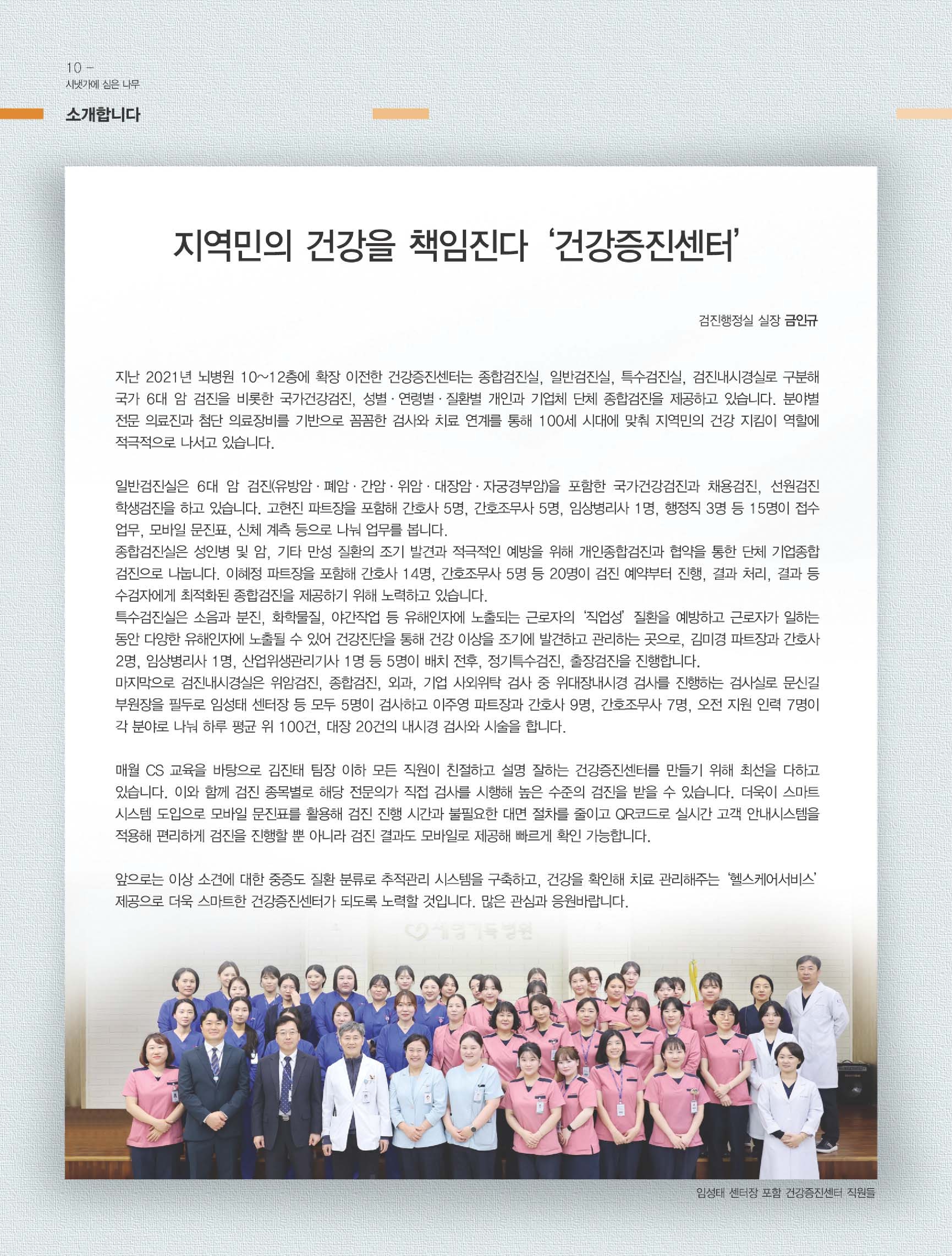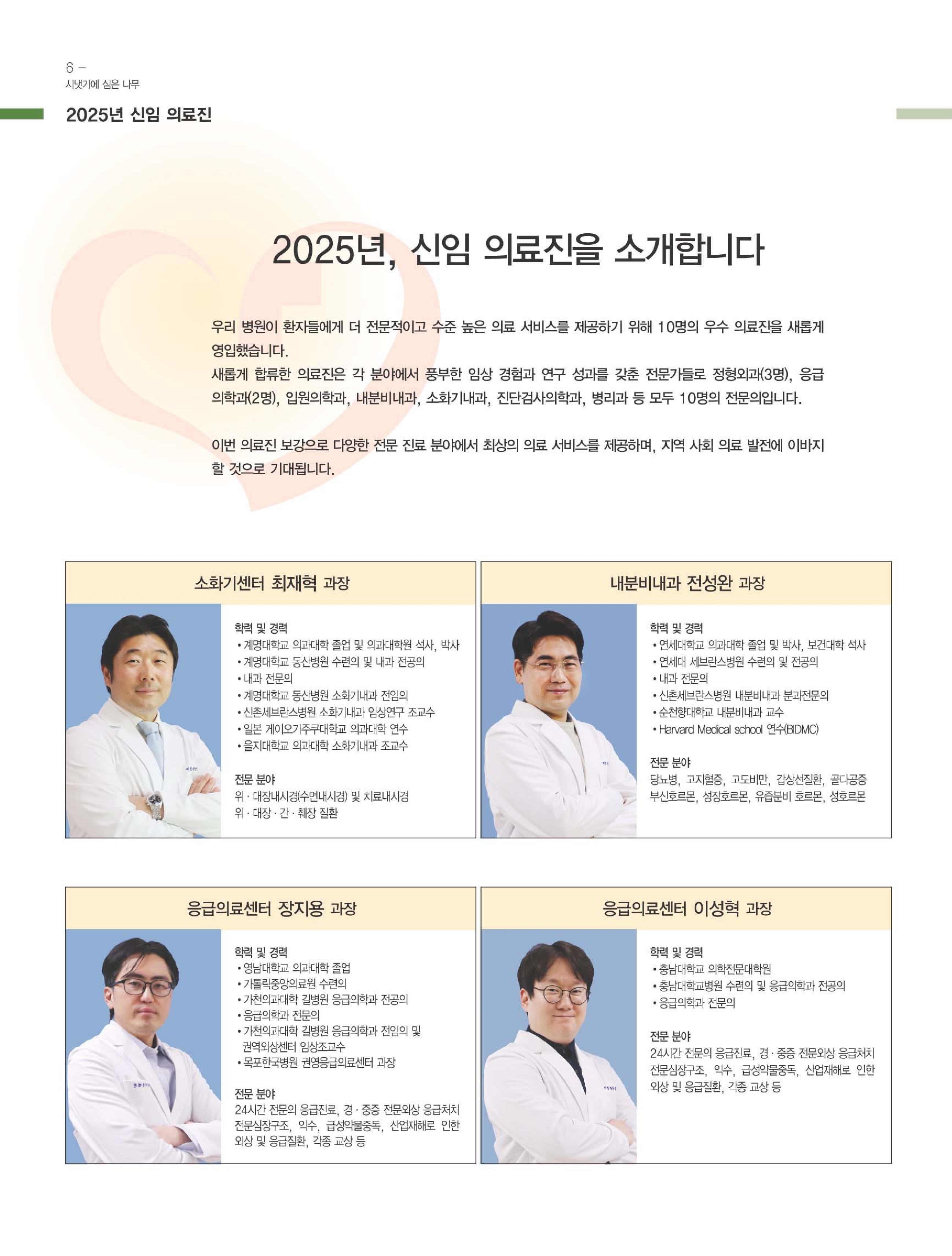 급성기 환자 치료뿐 아니라 퇴원 후 관리와 예방 활동까지 환자 중심의 의료 서비스를 제공할 것을 약속드립니다.